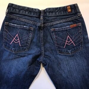 7 for All Mankind “A” Pocket Jeans in dark wash denim, curvy mid rise with wide flare. Five pocket construction, zipper fly, pink embroidered Letter A on the back pockets.