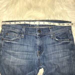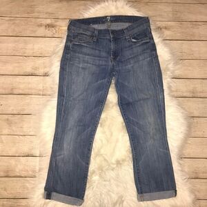 Great, preloved condition. 7FAM The Skinny Crop & Roll Denim Jeans. Medium wash with factory sandblasting. Cuffed Detail that can be undone to add a little length. Slight signs of wear especially around the zipper area. 98% cotton, 2% spandex.