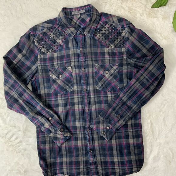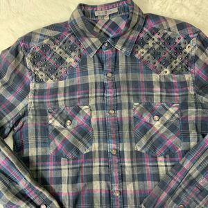 Women’s 7 for all mankind pearl snap cotton/linen blend shirt with studs at the shoulders. Excellent condition! Size medium