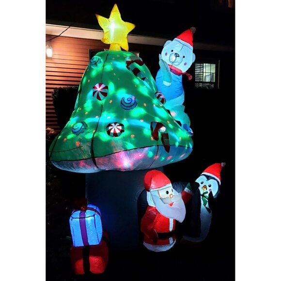 Festive Mushroom House & Christmas Tree Combo: This 7FT inflatable decoration features a cute mushroom house topped by a bright yellow star which also look like a Christmas tree. Friends gathering here with joy, santa, polar bear and penguin. It adds a playful, festive touch to your yard, combining the fun of a mushroom house and the holiday spirit of Christmas