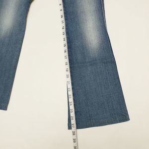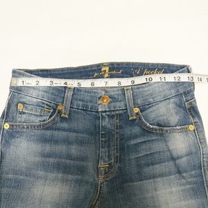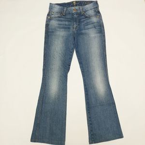 Excellent condition 7 For All Mankind "A" Pocket Flare Jeans 25" x 27.5". Color is dusty vintage blue. These jeans have been hemmed from a 30" to 27.5". Price reflects modification.