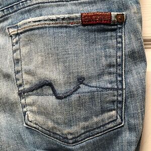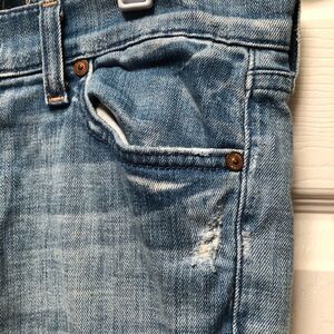 These jeans are in excellent pre-owned condition. They are distressed on purpose. Light wash.