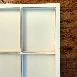 Because it is rustic looking by design, it does have some minor imperfections that make it look authentically vintage in addition to some minor blemishes from gentle use. There is a slight crack or line in the finish on one side that is about 3 inches long. There are some other minor imperfections from manufacturing or from use, including a small areas of missing paint or scratches. There is a slight bow in the tray so it's not perfectly flat but it's minor so likely will not notice when hanging or using for flat display. See picture for more details.