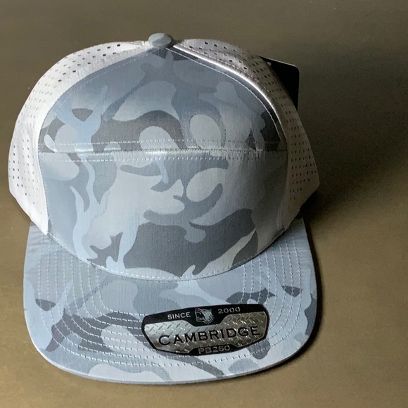 7-panel snap back cap. Stylish gray and white camo with a laser cut modern design.