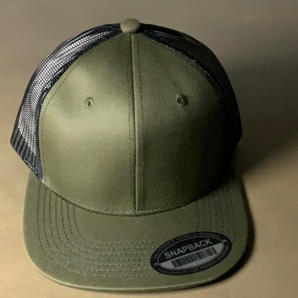 7-panel snap back cap. Stylish green and black with a mesh cut modern design.