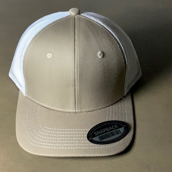 7-panel snap back cap. Stylish tan and white with a mesh cut modern design.