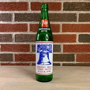 This 7Up Salutes commemorative bottle is a beautiful addition to any soda bottle collection. With a striking green color and a Liberty Bell design, it celebrates the 200th anniversary of America's independence in 1976. The brand, 7UP, is well-known and loved by many soda enthusiasts.