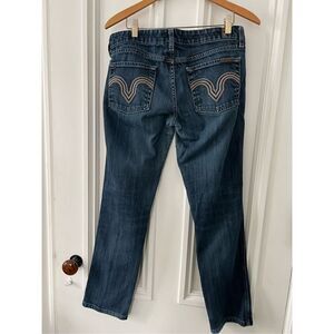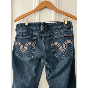 Women’s 7 for all mankind jeans boot cut great design on back pocket, size 29, waist is approximately 15.5 inches, rise approximately 7 inches, inseam is approximately 27.5 inches, lower rise, cotton and polyurethane, good used condition lots of life still