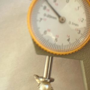 My pearl gauge measured about 8.4mm, but that includes the prongs, so I would estimate the pearl is about 7.5mm.