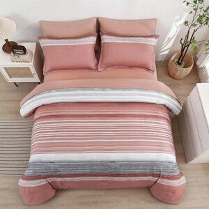 7pc Bed in a Bag Stripe Comforter/Sheet Set FULL White/Gray/Blush Pink Striped