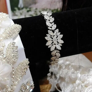 Looking for a unique and affordable Bridal package? Look no further! My Bridal package offers unbeatable value for all your bridal needs. Rest assured, my Tiara prices are unbeatable, so you can trust that you won't get ripped off. My Tiaras are of the highest quality and can easily compete with those of other stores but at a fraction of the cost. Compare my prices to theirs and see for yourself. My Cubic Zirconias are of superior quality, with a rating of AAA or AAAA, unlike Cubic Crystal Zirconias. I have conducted extensive research to ensure that you receive the best products possible. Some of the most well-known Bridal shops sell the same Tiara alone for $160.00/$398 . However, when you buy a Tiara from my Boutique, you're not just getting a Tiara. You'll also receive a Necklace, a pair of Earrings (some Bridal packages even include 2 pairs), a Bracelet, a Ring, a Bridal Sash (Belt), and a Pair of Shoe Clips. My Bridal package truly offers unparalleled value and quality.