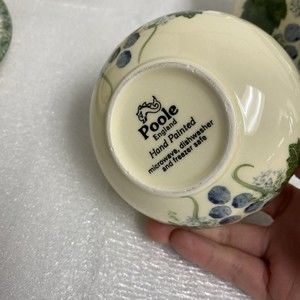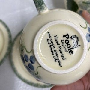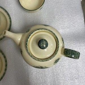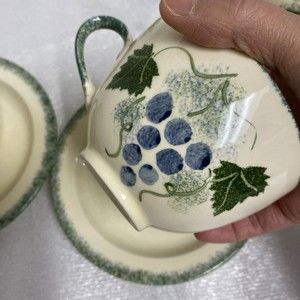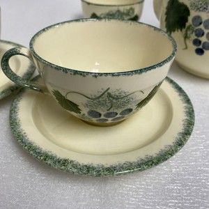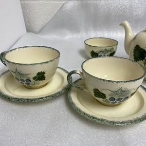 7pc Vintage England Handpaint Poole Pottery Green Vineyard Grape Teapot cup set. These are beautiful sets. Tea pot / coffee pot, tea cup / coffee cup with saucer and a sugar bowl