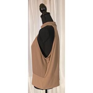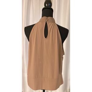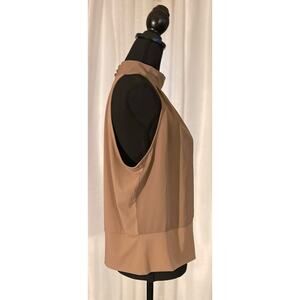 Tan/taupe mock neck, sleeveless top with front and back keyhole, three fabric covered button closure in back, and wide knit waistband. No noticeable flaws.