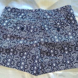 Brand new without tags. Size 4. New York & Co. 7th Ave. Stretch Mid Rise Suiting Collection Shorts in a Black/White Paisley Designer Print. These shorts are well constructed. A classic short style with an upscale pattern that's very versatile. Belt loops with Front slash pockets and Back buttoned welt pockets. 4” Rise. Zipper and hook-and-eye closure. Approximate measurements in photos. Brand new.