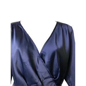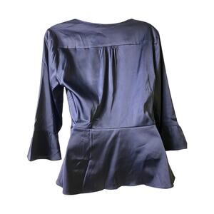 SIze small 7th Avenue navy blue peplum wrap top with 3/4 bell sleeves. 96% polyester. 4% elastane. 36 inch bust. 24.5 inch length.