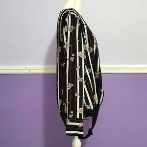 Add a classic chic style to your outfit with this mixed print striped bodysuit. Blouson style top with surplice front overlay and a V-neck undertop. Long sleeves with buttoned cuffs. Thong bottom with snaps for easy fit.. Shell is 100% polyester and bottom is 95% rayon and 5% spandex.