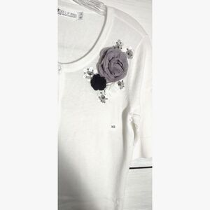 White button closure with Gray, Black, White, and Silver Sequined pinned Flowers on shoulder.