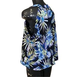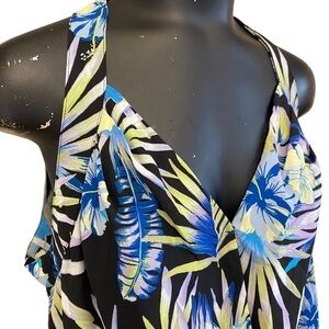 7th Avenue New York & Co Blue Yellow Tropical Print Top, Sz XXL. Sleeveless, Back keyhole and button closure, back elastic shirring at bottom hem.