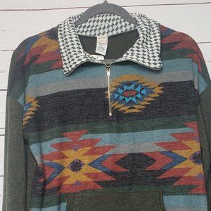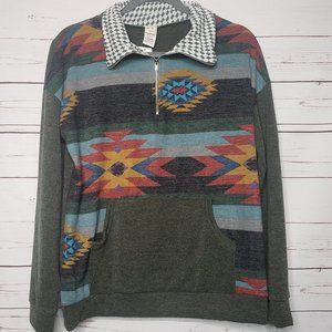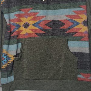 7th Ray Sweatshirt. Olive Green with Stipe and Aztec Print. 1/4 Zip Front. Contrast Collar. Kangaroo Pocket. Lightweight Sweatshirt. 96% Polyester 4% Spandex. NWT. Size Medium.