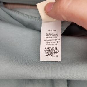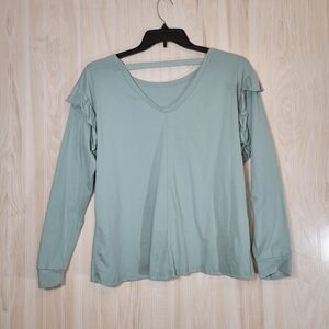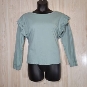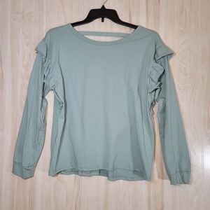 Light blue long sleeve 100% cotton sweatshirt with ruffled along the tops of the sleeves.
