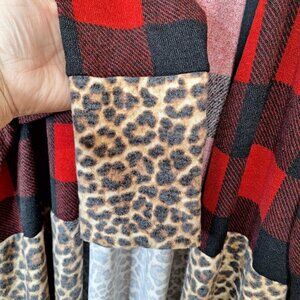 Soft and flowy three print long line cardigan, Red/Black Buffalo Check/Plaid on the top, Cheetah Print in the center, and Solid Black on the bottom, very unusual, and very chicGreat for a great layering piece, lightweight coverup, and travel wear, can be dressed up or downHand Wash OnlyVery good preowned conditionSmoke free, pet friendly homeEvery effort has been taken to remove any pet hair that may have been on the item, however it is possible I may have missed a stray hair or twoItem has been washed according to care instructions in unscented detergent and hung to dry