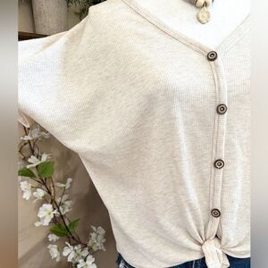 7th Ray Neutral Waffle Knit Front Tie Button Down Oversized Top