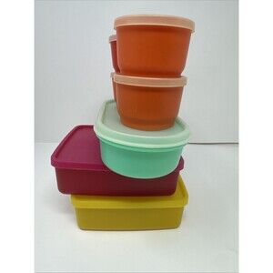 7x Vintage Tupperware Snack Set - 2 square away keeper 4 cups orange red yellow