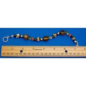 For sale is an 8 1/2 inch beaded bracelet with beads made of glass, stone, plastic, and metal.