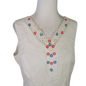 Sleeveless. V-neck. Crochet and floral embroidered trim.