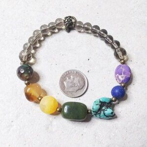 8" ~ 7 Chakra Bracelet! Loaded w. Semi-Precious Stones + Smokey Crystal Beads