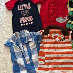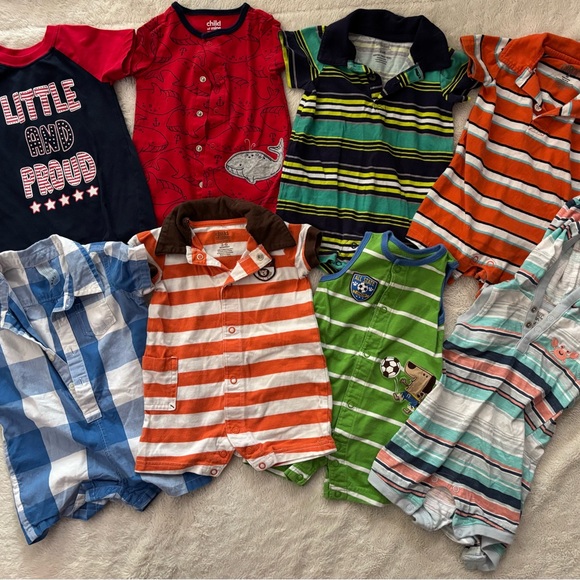 Set of colorful baby rompers. Includes stripes and patterns. Perfect for casual wear. 3-6 and 6m sizes