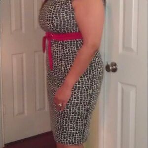 Black and white dress with red belt. Back zipper great for wearing to winter weddings