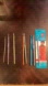 8 Boye crochet hooks, tapered throat, anodized aluminum in the following sizes; 4.25mm, 5mm, 5.5mm (2), 6.5mm (3). There’s no size on the smallest hook.