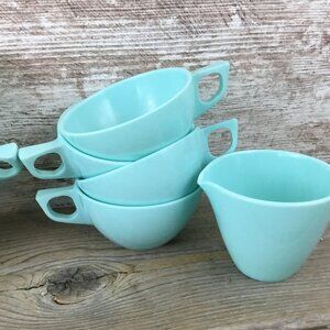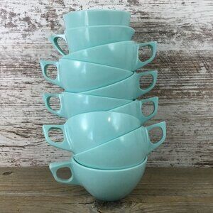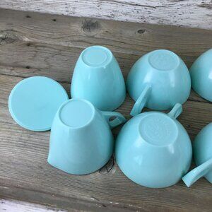 8 Coffee Cups Sun Valley Melmac Aqua Turquoise & Creamer Sugar Bowl Lid Vintage