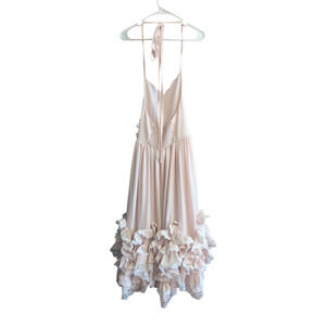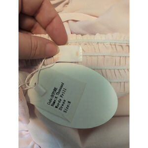 NWT Dollcake A Thousand Words frill dress. Pale pink with white lace flower on the bodice. Lace trimmed ruffles at the hem. Corset back