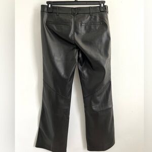 These sleek pants have a vegan leather construction that shapes a low-rise fit complete with belt loops and a hidden top clasp with a hidden zipper fly to wide flare pants. . Functional welted back pockets
