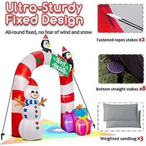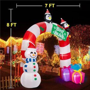 -【Eye-Catching Design】- 8FT x 7FT large size inflatable archway. Cute snowmen, penguins, gift boxes, and red and whit arches are all with bright LED lights. It will be your most conspicuous outdoor welcome decoration this winter!
