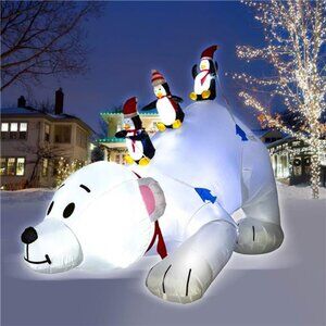 8 Feet Christmas Inflatable Decor Penguins Fishing on Big Polar Bear, with LED