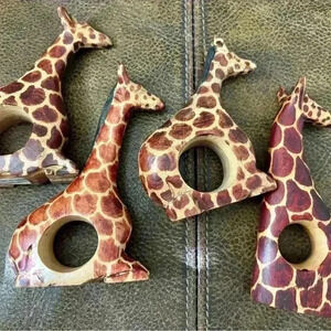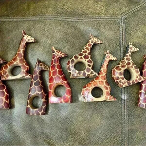 These were hand carved in Kenya. They are the cutest collection of 8 unique wooden giraffe napkin holders. They are one of a kind.