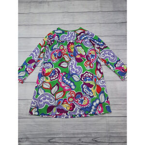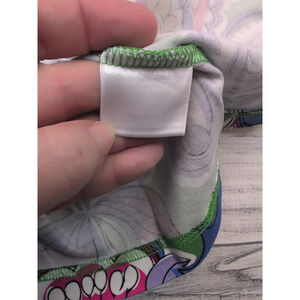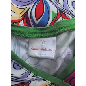VGUC Hanna Andersson Me Myself & I play dress. Green with pink, blue and purple floral print. Faux wrap bodice. Light wash wear