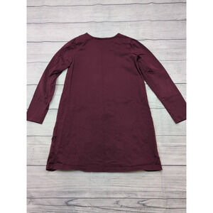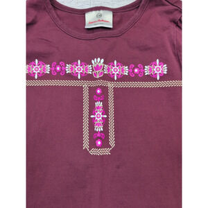 VGUC Hanna Andersson screenprint dress. Burgundy with white and purple flower graphic on the bodice. Light wash wear