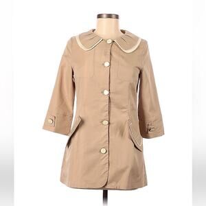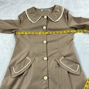 Classic and sweet this peacoat features a double peter pan collar, bow print buttons, and a line silhouette. Fully lined with a few pulls on inside liner, see last pics.