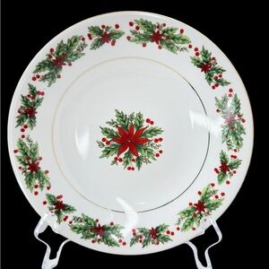 Add a festive touch to your holiday meals with this set of eight Lynns Holly Wreath fine china bowls. The 8 1/4" round bowls feature a beautiful poinsettia design, perfect for serving soup or cereal. Great condition! No chips or cracks!