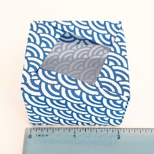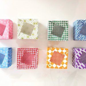 Handmade, hand-folded set of 8 small square origami masu boxes with windows. Each one is unique and made with geometric and floral patterned paper in multiple colors.