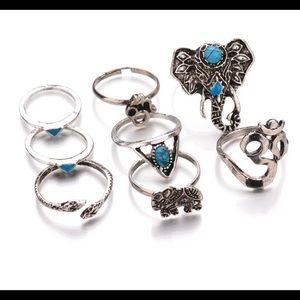 8 piece midi ring set consisting of an elephants, a snake, two OM symbols and turquoise studded rings. All vary in size and two are adjustable. NEW