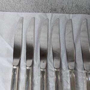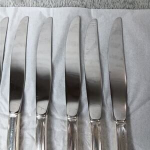 Set of 8 Oneida Silversmiths Silver Plate Clairhill-Fairhill Hollow Handle Dinner Knives. Vintage from the 1970's. Preowned with some light scratches and a couple tarnish spots. From a non-smoking home.
