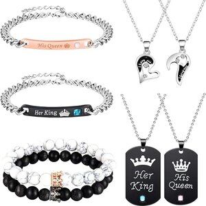 Romantic design: some of bracelets are engraved with letter of [Her King] and [His Queen], 2 pieces of necklaces are engraved with letters of [I love you], which can show your love and warmth to your partner, they are sure to be moved by this design