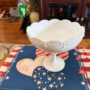 • 1- Vintage Indiana White Milk Glass Teardrop Compote Pedestal Bowl with Scalloped Edge