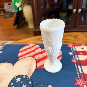 • 1- Vintage White Milk Glass Vase Harvest Grapes Footed 7 3/4”