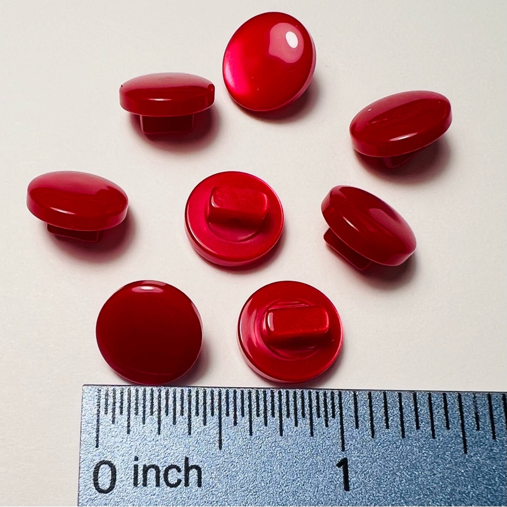 8 Buttons in Red. Dome shaped, small shank buttons. Excellent condition.